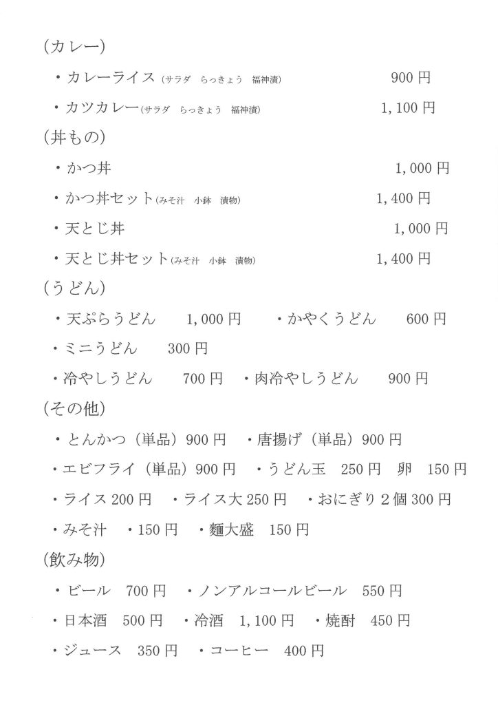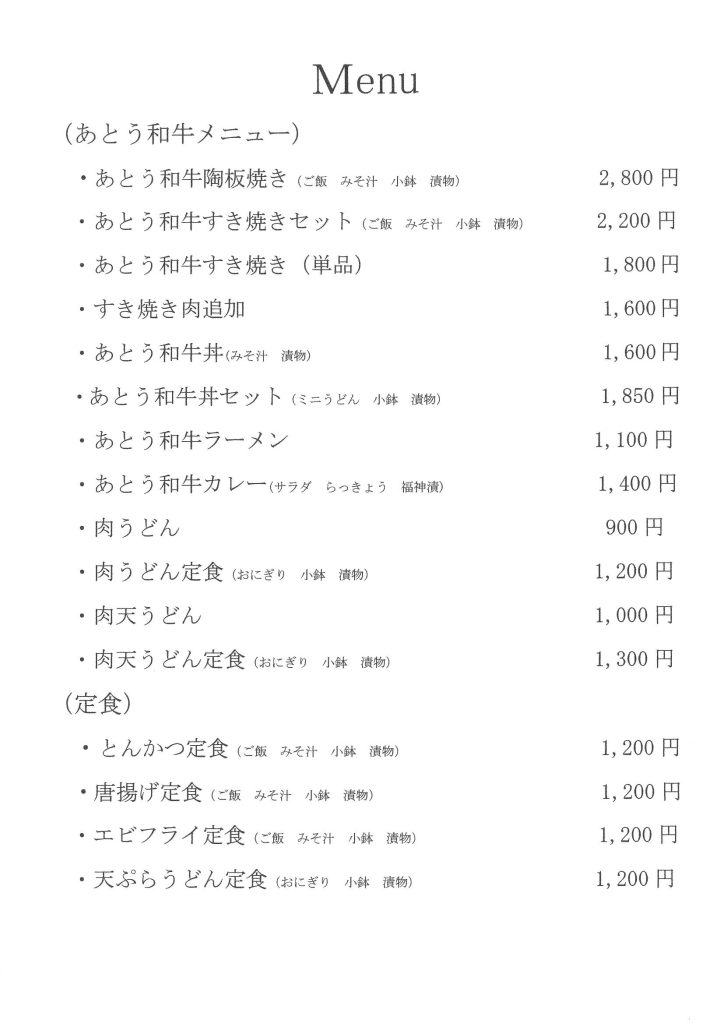 お食事処「長門峡」のメニュー料金が変わりました。 新しい料金は以下となります。