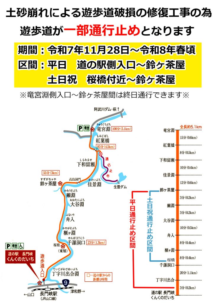 長門峡遊歩道の通行止めについて 2025.11.20 11月28日(金)より、土日祝日を除いて、道の駅長門峡側からの遊歩道は入り口から通行止めとなります。 ただし、土日祝日は道の駅長門峡側から途中(東屋辺り)まで通行できます。 一覧に戻る