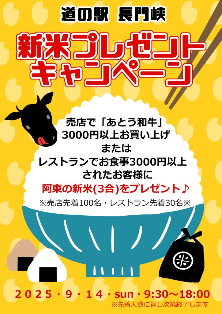 9月14日(日)、あとう和牛3,000円以上お買い上げのお客様(先着100名)に、阿東の新米(3合)をプレゼントします。